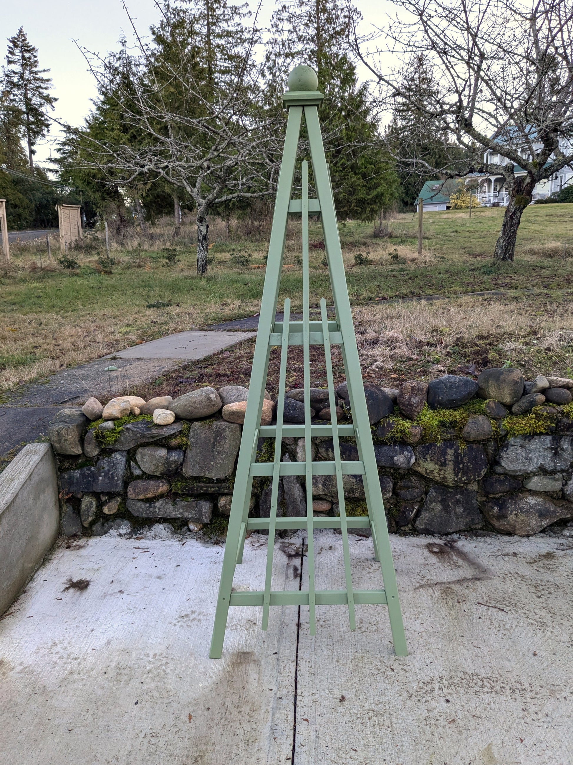 French Moss Green solid stain Western Cedar 6' Obelisk Tower. Dimensions: 70" Tall, 24" Base with 3 vertical pickets per side and sphere finial. Photos are of actual product to be shipped, only one available.